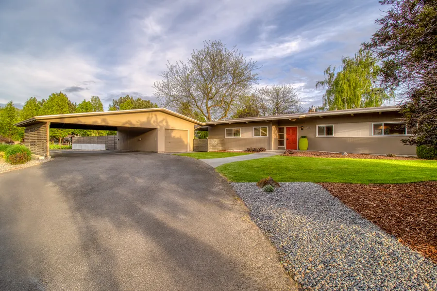 One of a kind 1955 MCM home, thoughtfully modernized! Exquisite original mahogany and birch paneling & cabinets crafted by Whitehouse Crawford. Open floorplan with rustic stone flooring, high beamed ceilings accented by cove lighting. Back-to-Back gas fireplaces on the main floor warm the great room and create ambiance in your perfect entertaining space. Modern kitchen features quartz countertops and updated appliances while staying true to the aesthetic. Updated primary bath & laundry room make main-floor living easy. High-ceiling lower level has egressed 3rd bedroom, bonus room with wood fireplace, custom tiled bath, heated flooring throughout, and exterior access stairway. Park-like .87 acres bordered by mature trees and landscaping.