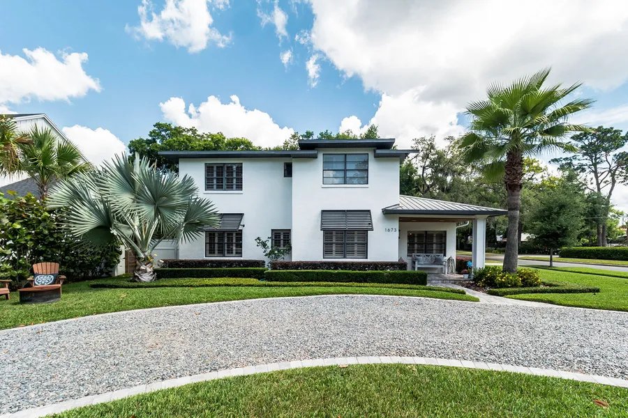 In the heart of Winter Park, this extensively renovated modern farmhouse offers exceptional value for the location. A circular drive and inviting front porch welcome you into light-filled living spaces enhanced by all-new energy-efficient windows, custom millwork and designer finishes throughout. The functional layout includes a first-floor guest suite, additional well-appointed bedrooms and updated baths. The kitchen opens seamlessly to the dining and family rooms, featuring custom cabinetry, stone countertops, stainless appliances, walk in pantry and built-in wine area. The family room flows to a covered lanai and summer kitchen, overlooking a paver deck, pool, fire pit and putting green, ideal for year-round entertaining. The fully fenced backyard offers privacy and access to a detached garage with additional storage. Upstairs, the primary suite features a private balcony, a sitting area, a walk-in closet, and a spa-inspired bath with a freestanding tub and an oversized shower. An additional upstairs fourth bedroom ensuite, currently used as a gym, offers flexibility for a home office or nursery. Renovated with quality and intention, including updated systems and recent roofs. Ideally across from Phelps Park and just a few blocks from Interlachen Country Club and the Winter Park Racquet Club.