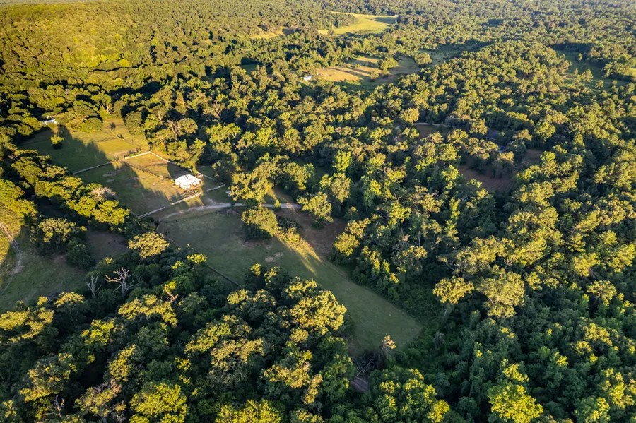 A live creek runs through the property, enhancing its picturesque and tranquil ambiance. The expansive acreage provides ample privacy and space for outdoor activities, with beautiful wooded areas that create a peaceful retreat.