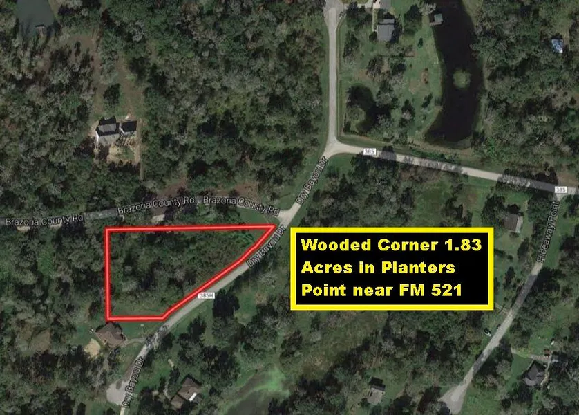 Wooded Corner 1.83 Acres in Planters Point. 403 ft Dry Bayou Dr Frontage & 463 ft Brazoria County Rd Frontage. Needs Well/Septic! No HOA fees! Deed Restricted Community. Verify Restrictions! Deed Restrictions do not allow Manufactured or Mobile Homes! Lot is to small for livestock or horses according to deed restrictions. Low Taxes! No Pipelines! Short walk down street to 75-Acre Brazos River County Park. Enjoy bird watching, wildlife, walking trails, playground & canoe launch. 10 miles to FM 521, TX-288 & Angleton. 25 miles to Freeport & 45 to Houston. Google Maps marks lot at wrong location when address is used. Follow specified directions to find lot.