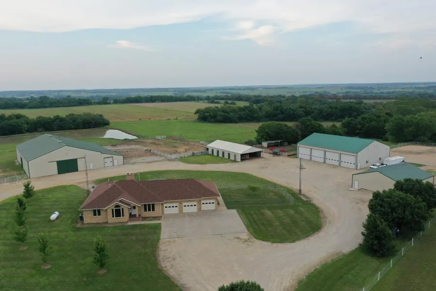 The 45’x42’ detached garage offers great finished space for additional vehicles and toys and sits just off to the east of the attached 3 car garage with the house. The 48’x18’ loafing shed sits just to the south of the detached garage and has automatic waterers and stalls that turn out to the front pasture. Just to the west sits the 140’x240’ outdoor arena. Fully piped fenced with 6 attached cattle runs and gated entrances allowing one to run cattle to and from holding areas. With all the precision, dirt work, packing and sand finishing, this arena is ready to be used full force! Horse walker just off to the east. The 60’x80’ finished shop offers 4 bays, work space, car lift, fully wash bay with drain pit, air compressor, bathroom, wash and dryer all wrapped in 2”x8” exterior walls. Overhead heat keeps this space perfect year-round. Newly installed 14’x18’ overhead automatic doors throughout. Step out and head to the 72’x36’ hay barn. Perfect space for implement storage and hay storage. You can sure pack the square bales to the gills after loading them up off the pasture. 2,000 square bales can be stacked and stored in this barn. Just off the backside of the hay barn, find the additional loafing shed, corral area and loading chute, tying to every area of the arenas.
