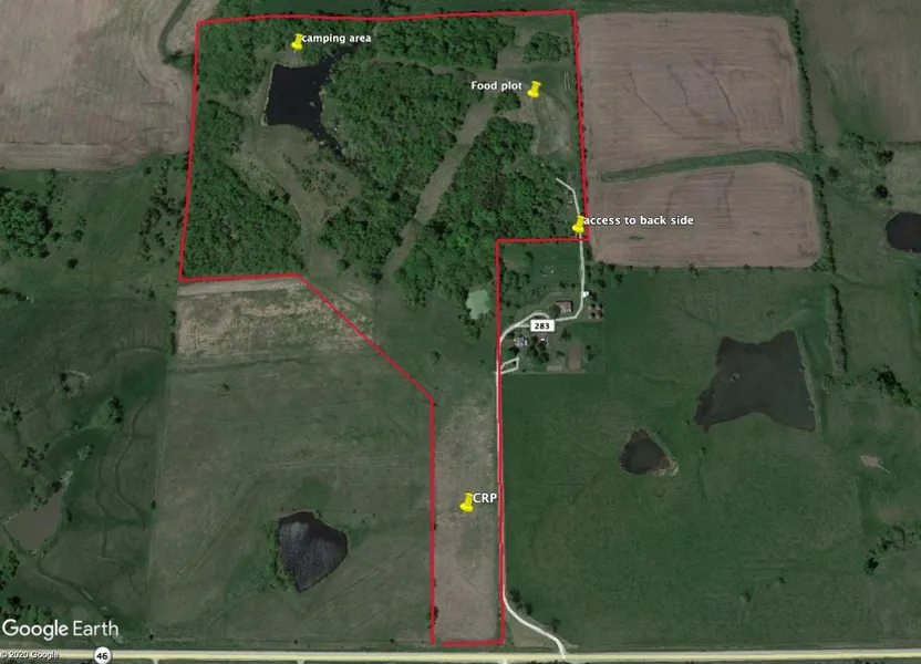 Worth County Missouri Hunting, Fishing and building acreage for sale. This 60 m/l acre tract is just north of hwy 46, 2 miles east of Grant City Mo. Access is off county road Nuthatch. Great deer and turkey hunting. There is a 3 1//2 acre secluded pond that is stocked with bass, crappie, bluegill and channel catfish. Electricity and rural water are available. 5+-acres CRP paying approximately $800 per year. No one lives in the old home showing on the map and it will be demolished soon. This is my personal property and I will remain the owner of the property on the east side of Nuthatch. If you buy the 60 acres you will have rights to hunt and fish on the remaining 70 acres. Seller is a licensed real estate broker in the state of Missouri. Call, text or email questions to Donnie McClellan at 816-752-8880